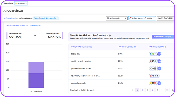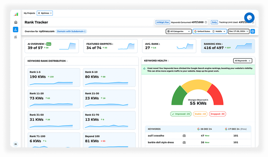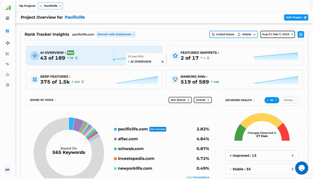 - Google AI Overviews Analysis Monitor how your website appears in Google’s AI-generated overview sections and track visibility trends over time.