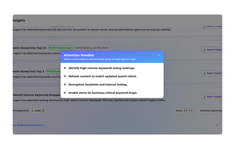 - 3 AI Agents Automated assistants that help you track SEO performance, detect opportunities, and suggest actionable next steps without manual effort.