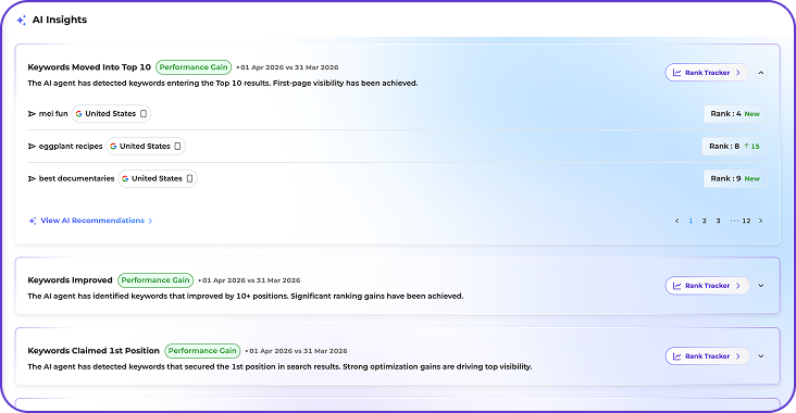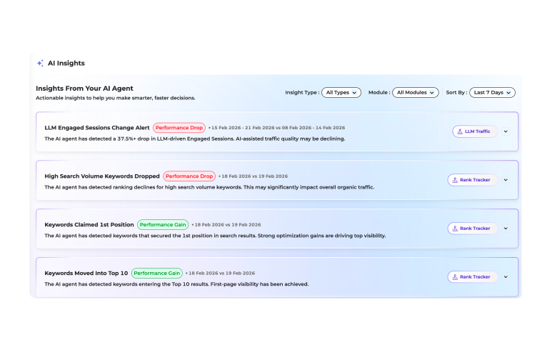 - 4 AI Agents Automated assistants that help you track SEO performance, detect opportunities, and suggest actionable next steps without manual effort.