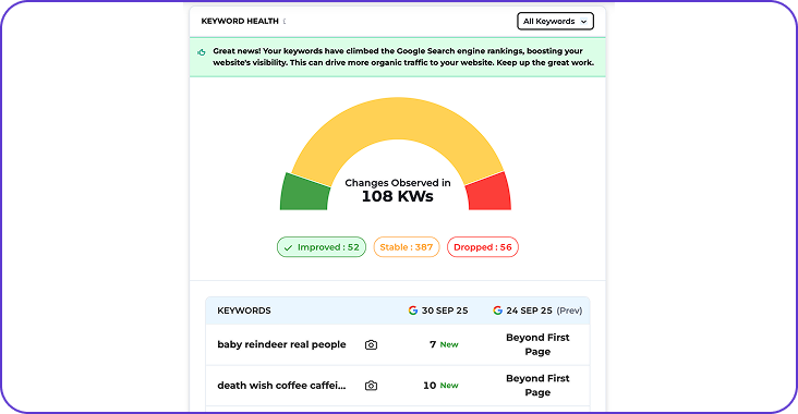 - 2,000 Daily SERP Tracking Automatically track up to 2,000 keywords daily to monitor rankings, visibility changes, and new competitors entering the SERPs.