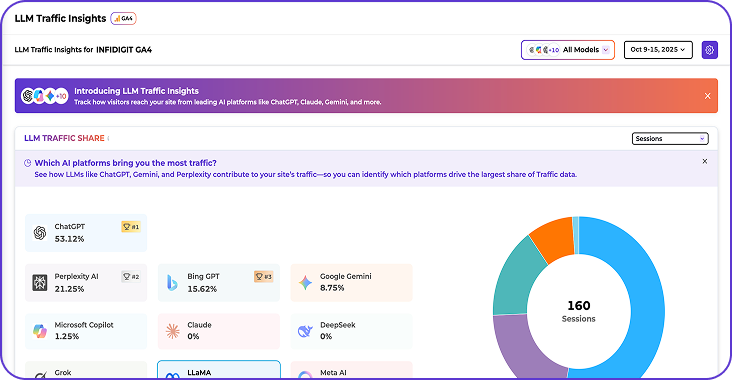 See how much traffic your website is getting from AI platforms like ChatGPT, Gemini, Perplexity, Grok, and more.