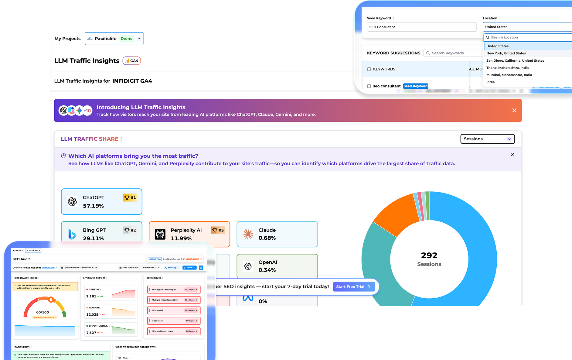 - Automated SEO Audits Run comprehensive, automated audits of your website to identify technical SEO issues, content gaps, and optimization opportunities — no manual effort needed.